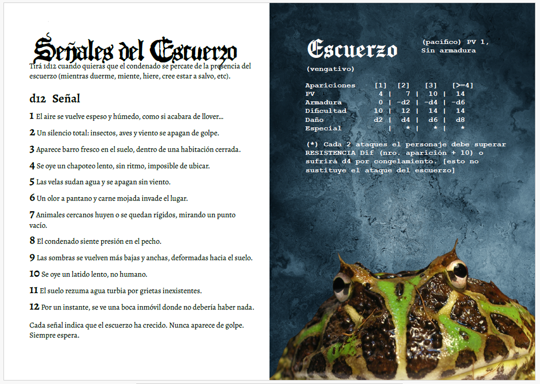 Este es un suplemento para Mörk Borg inspirado en el cuento “El Escuerzo” de Leopoldo Lugones. Fue creado para la VI Edición de la FolcloreRolJam 2025 «Criaturas del folclore» organizado por El Refugio de Ryhope.